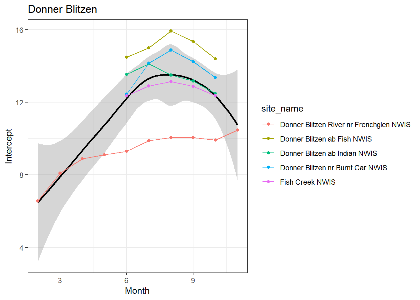 result %>%filter(basin =="Donner Blitzen") %>%ggplot() +geom_smooth(aes(x = month, y = est_mean), color ="black") +geom_point(aes(x = month, y = est_mean, color = site_name)) +geom_line(aes(x = month, y = est_mean, color = site_name)) +labs(title ="Donner Blitzen", x ="Month", y ="Intercept") +#geom_vline(xintercept = 0, linetype = "dashed") +theme_bw()