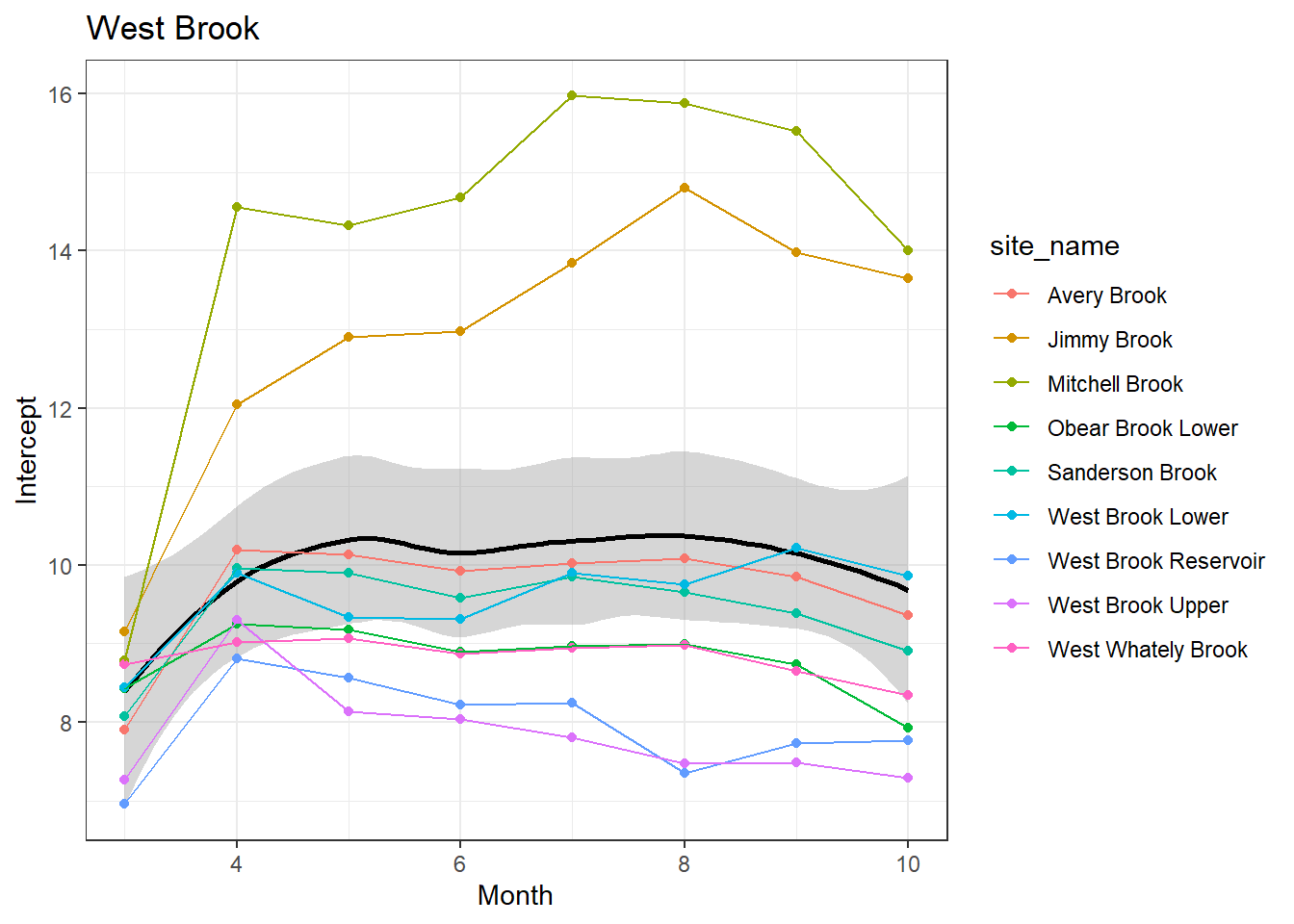 result %>%filter(basin =="West Brook") %>%ggplot() +geom_smooth(aes(x = month, y = est_mean), color ="black") +geom_point(aes(x = month, y = est_mean, color = site_name)) +geom_line(aes(x = month, y = est_mean, color = site_name)) +labs(title ="West Brook", x ="Month", y ="Intercept") +#geom_vline(xintercept = 0, linetype = "dashed") +theme_bw()