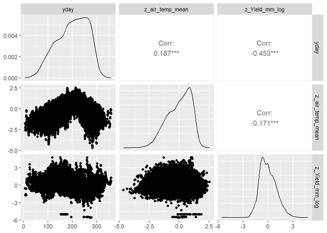 ggpairs (dat %>% select (yday, z_air_temp_mean, z_Yield_mm_log))