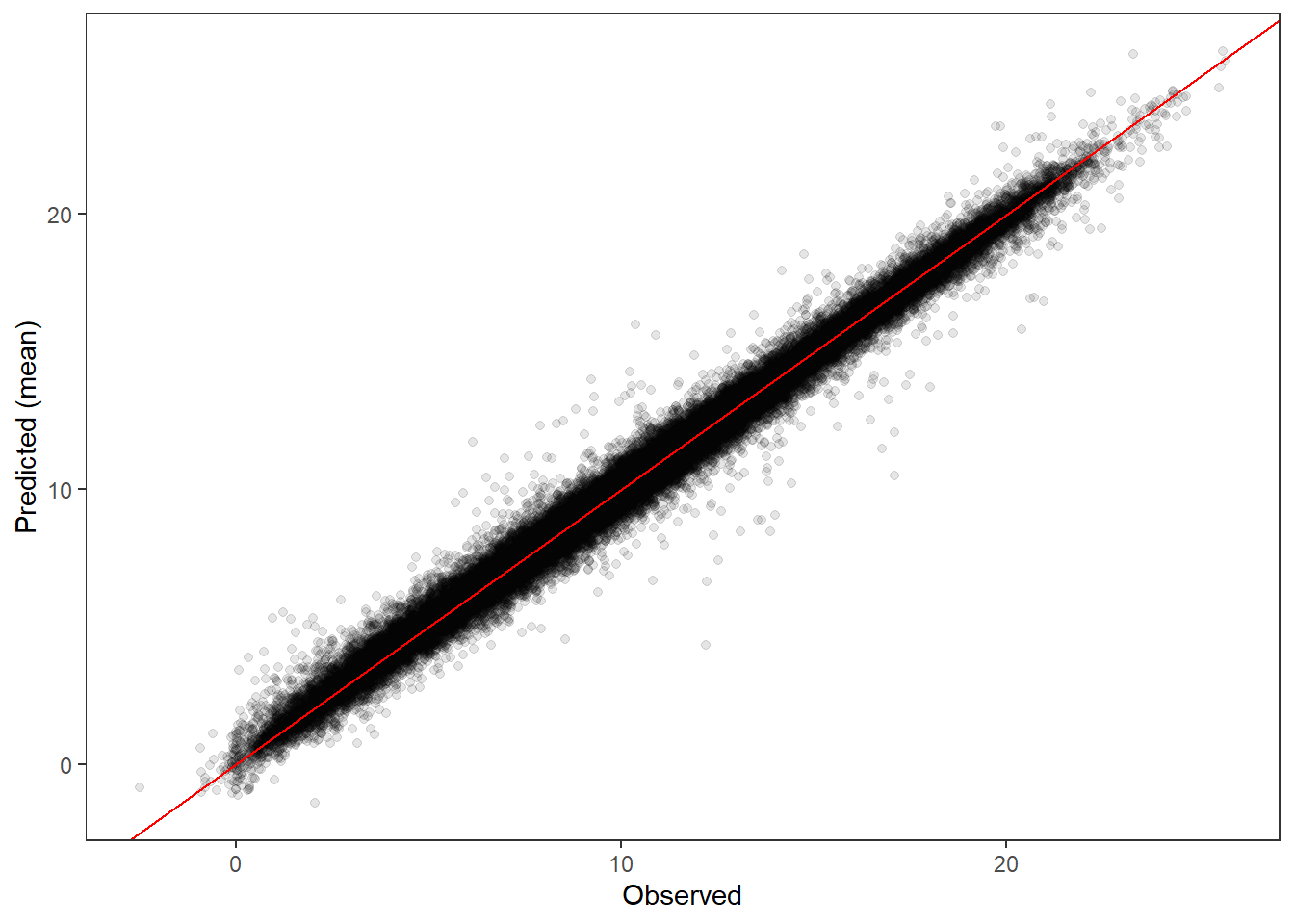 xlab ("Catchment area (log scale)" ) + ylab ("Intercept (posterior mean)" ) #+ #ggpubr::stat_cor()
