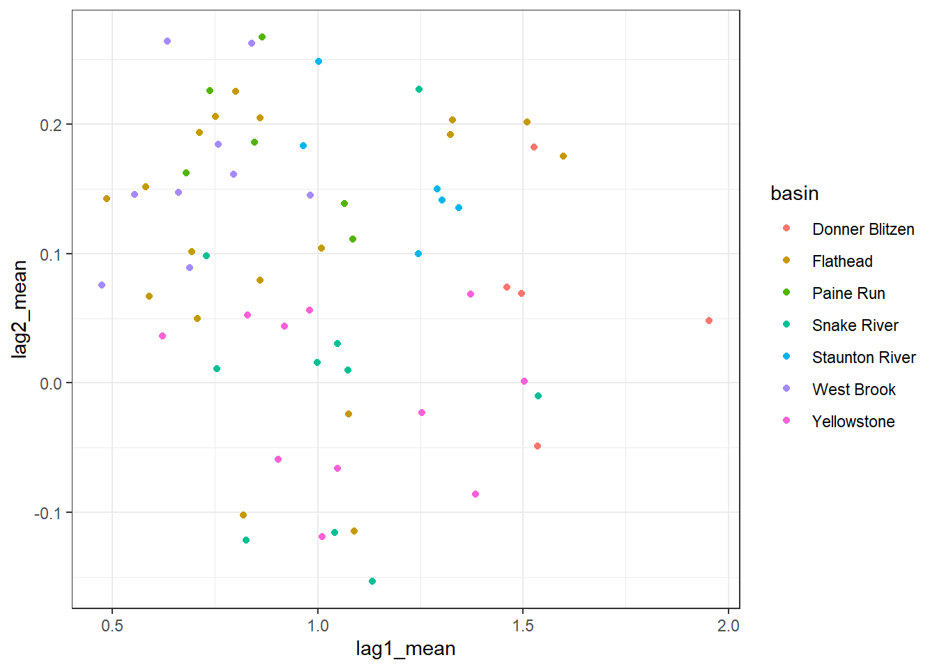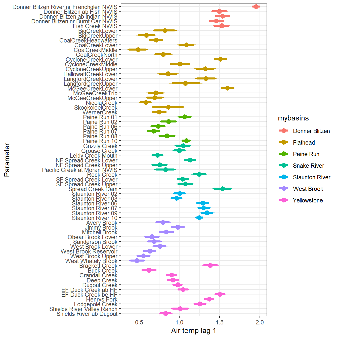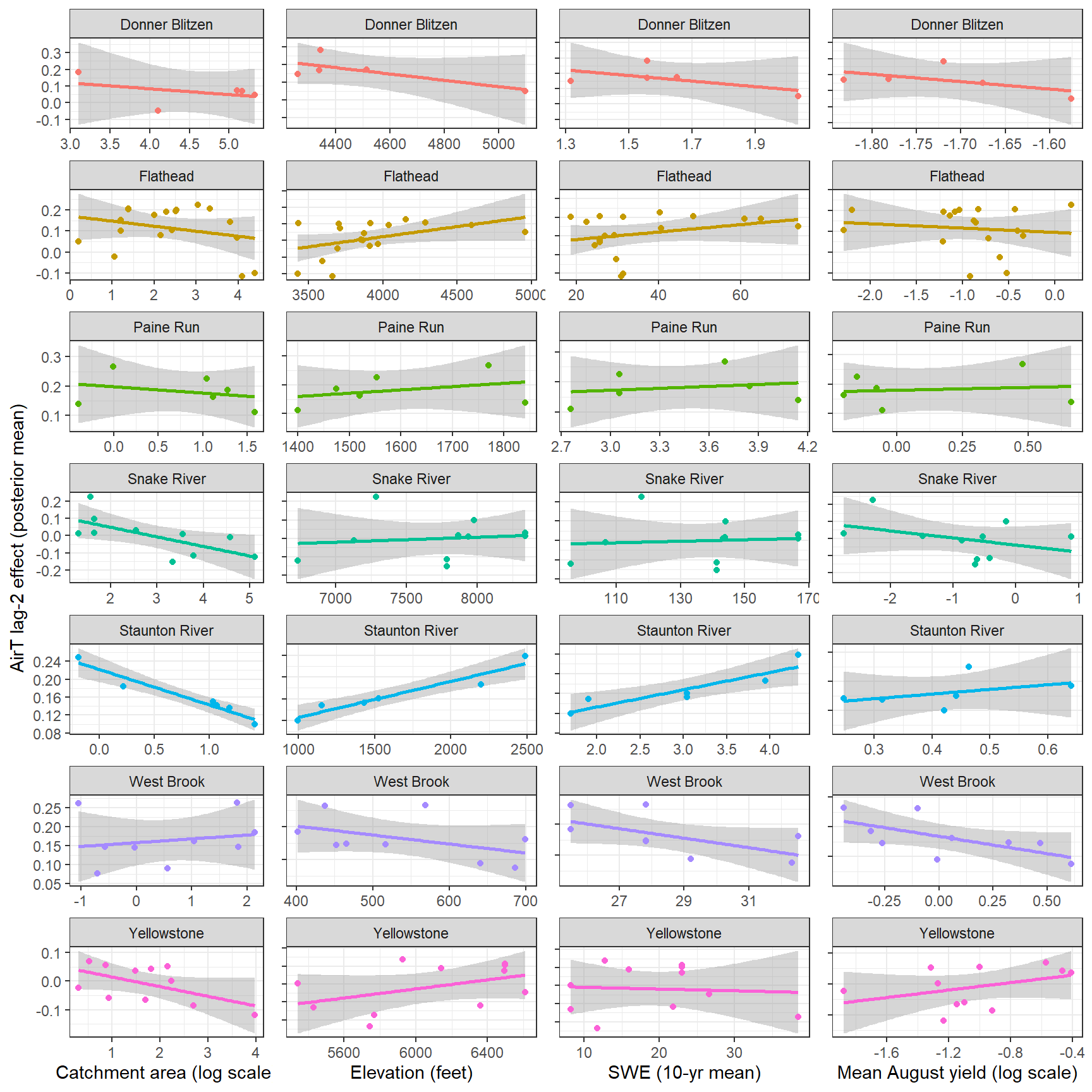 xlab ("Catchment area (log scale)" ) + ylab ("AirT lag-1 effect (posterior mean)" ) #+ ggpubr::stat_cor()