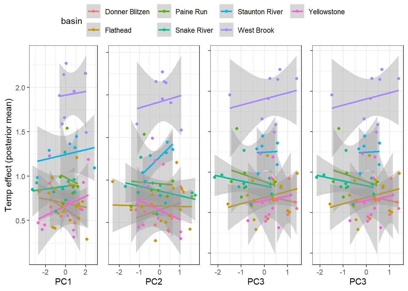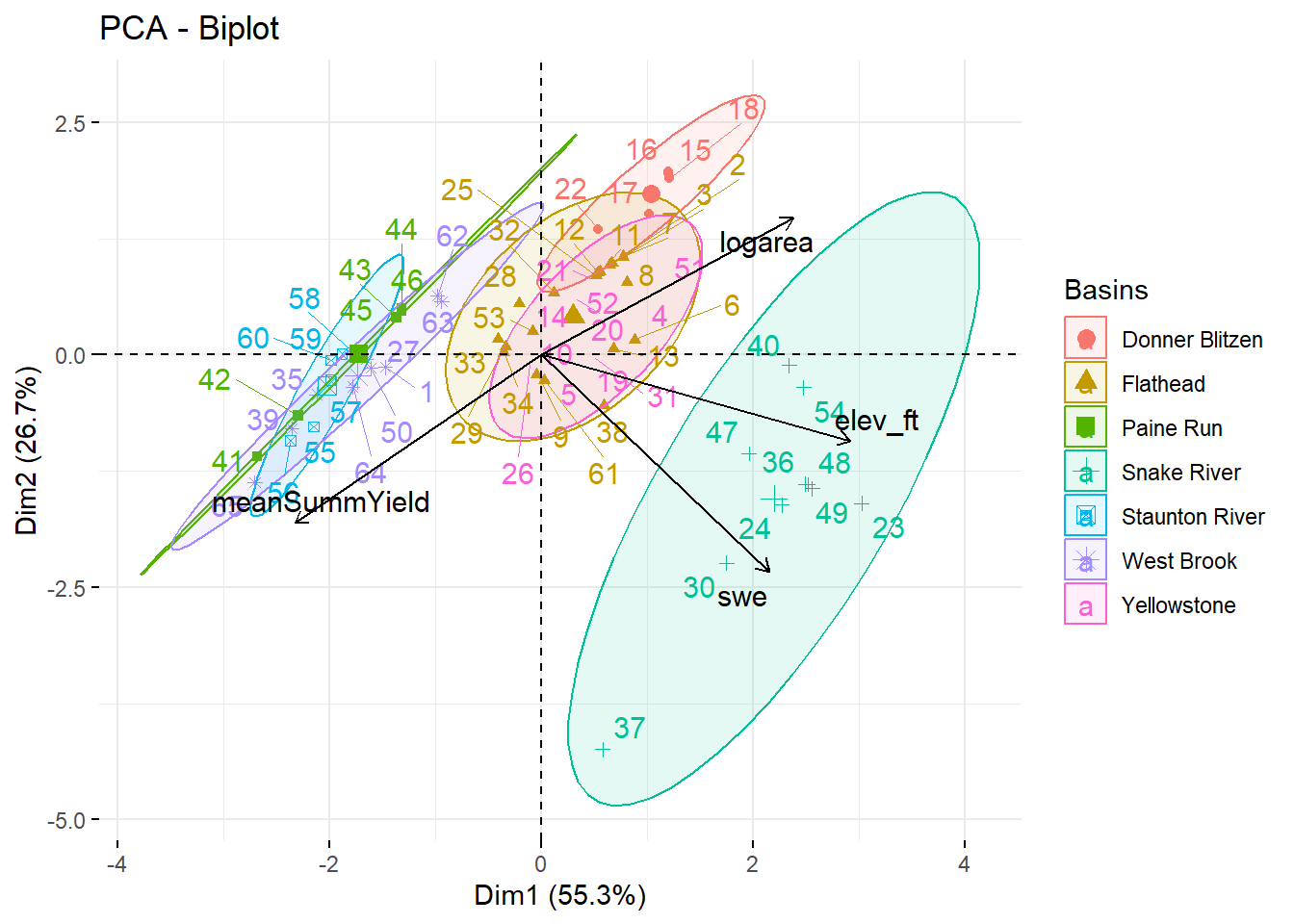 *PCA on variables standardized by basin removes the regional effects and separates sites by more relevant axes of variation. Within basins, sites mostly vary along a ~single axis of small catchment area, high elevation, and snowmelt-dominated ...to... large catchment area, low elevation, and rain-dominated (less snow).*