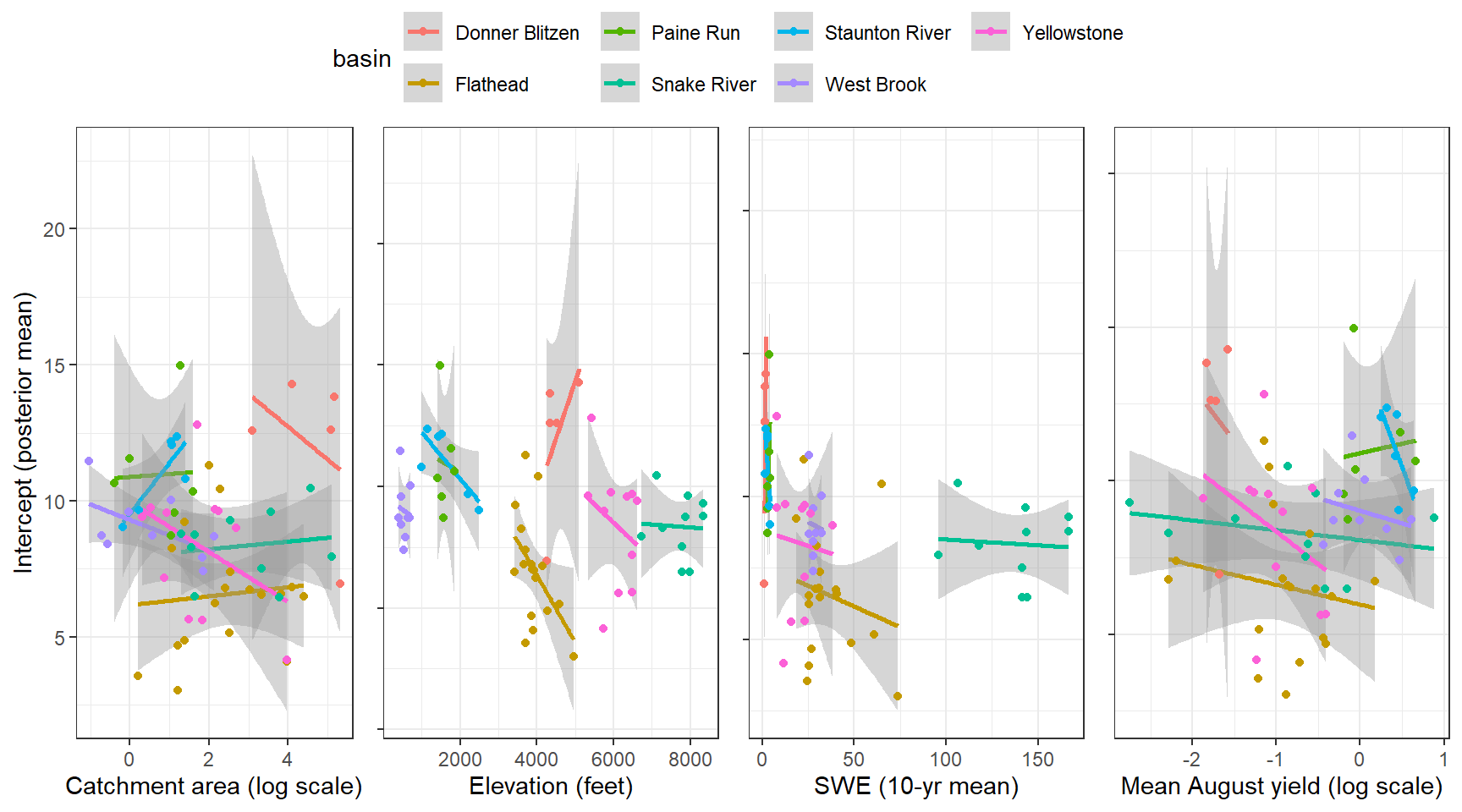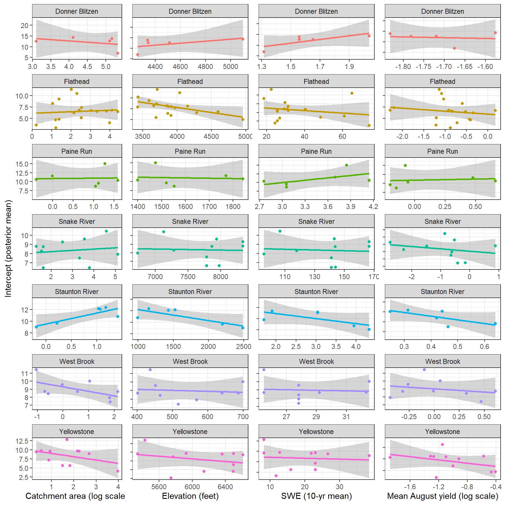 xlab ("SWE (10-yr mean)" ) + ylab ("Intercept (posterior mean)" ) + #ggpubr::stat_cor() +