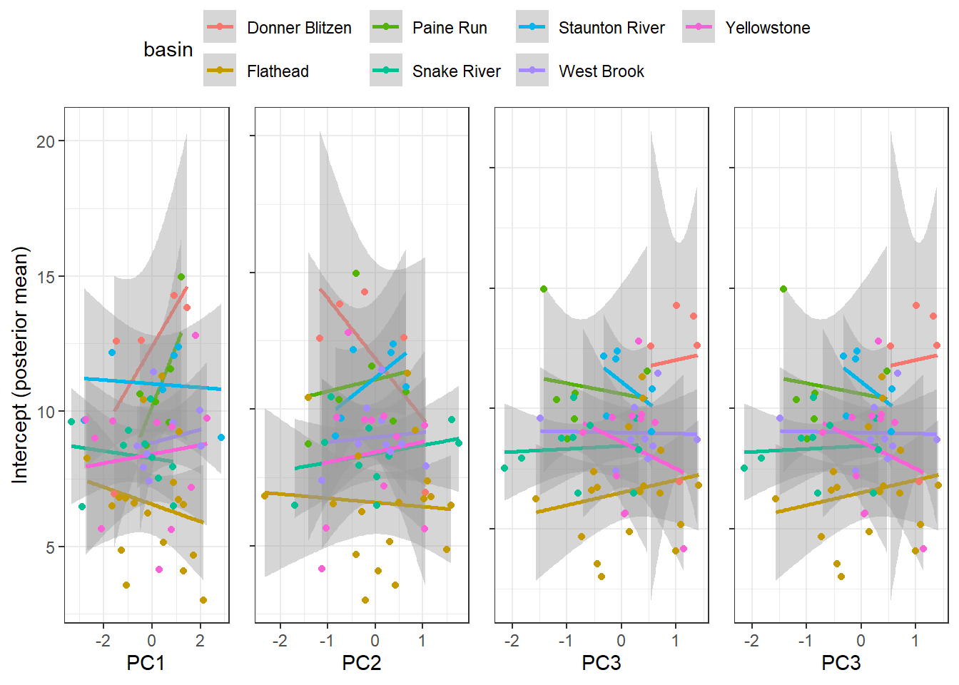 ylab ("Intercept (posterior mean)" ) + #ggpubr::stat_cor() +