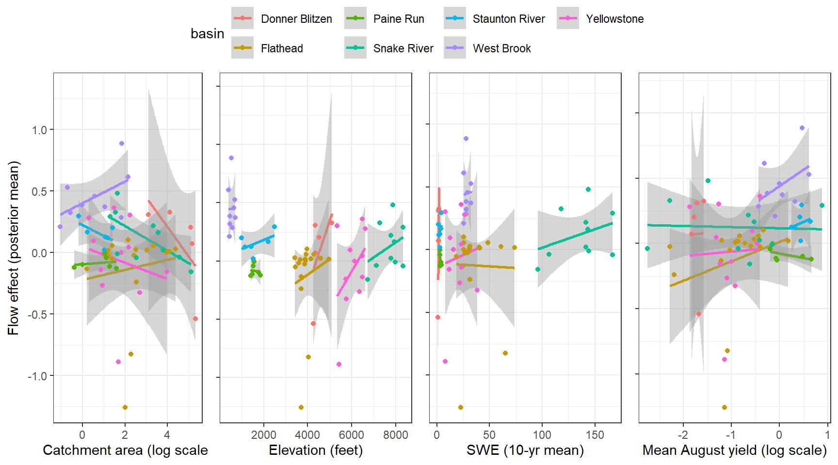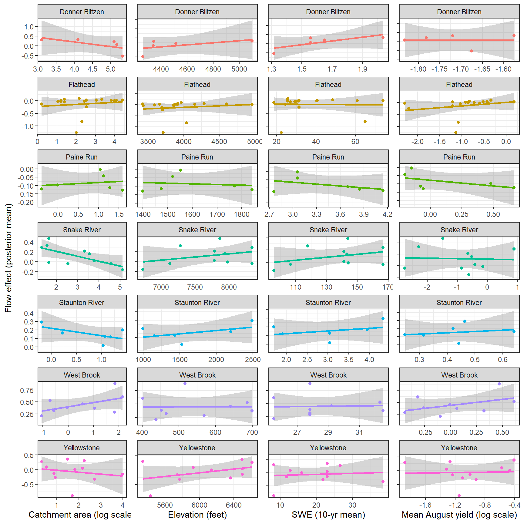 xlab ("Mean August yield (log scale)" ) + ylab ("Flow effect (posterior mean)" ) + #ggpubr::stat_cor() +