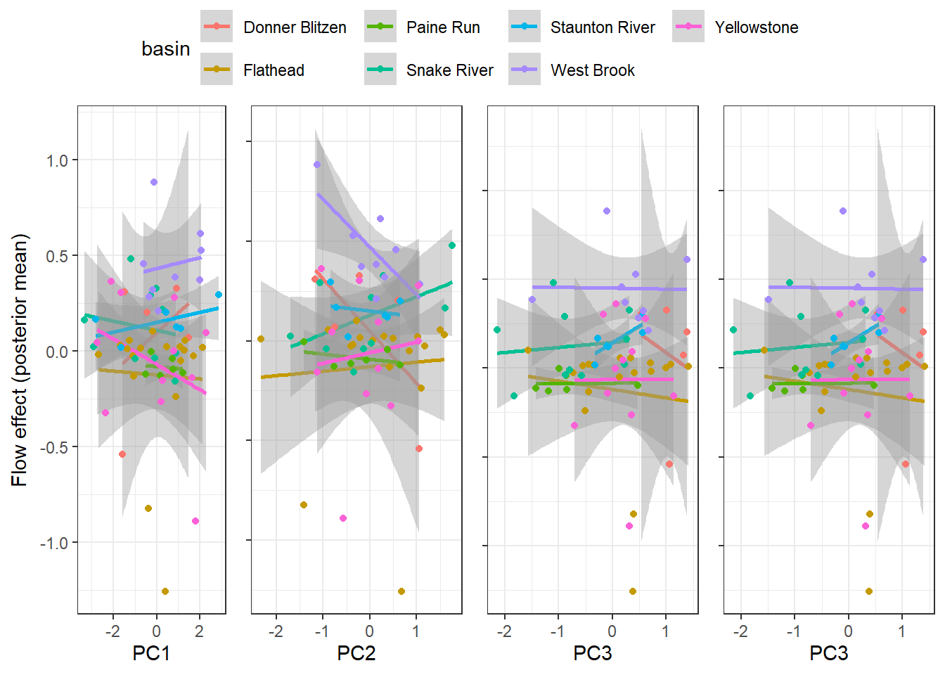 ylab ("Flow effect (posterior mean)" ) + #ggpubr::stat_cor() +