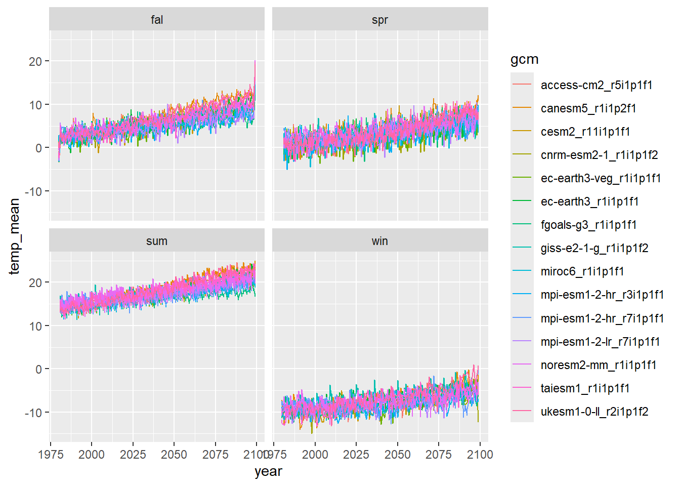 write_csv(dat_summ, "Data/Derived/SeasonalMeanAirTemp_Summarized_1980-2099.csv")dat3 <- read_csv("Data/Derived/SeasonalMeanAirTemp_byGCM_1980-2099.csv")