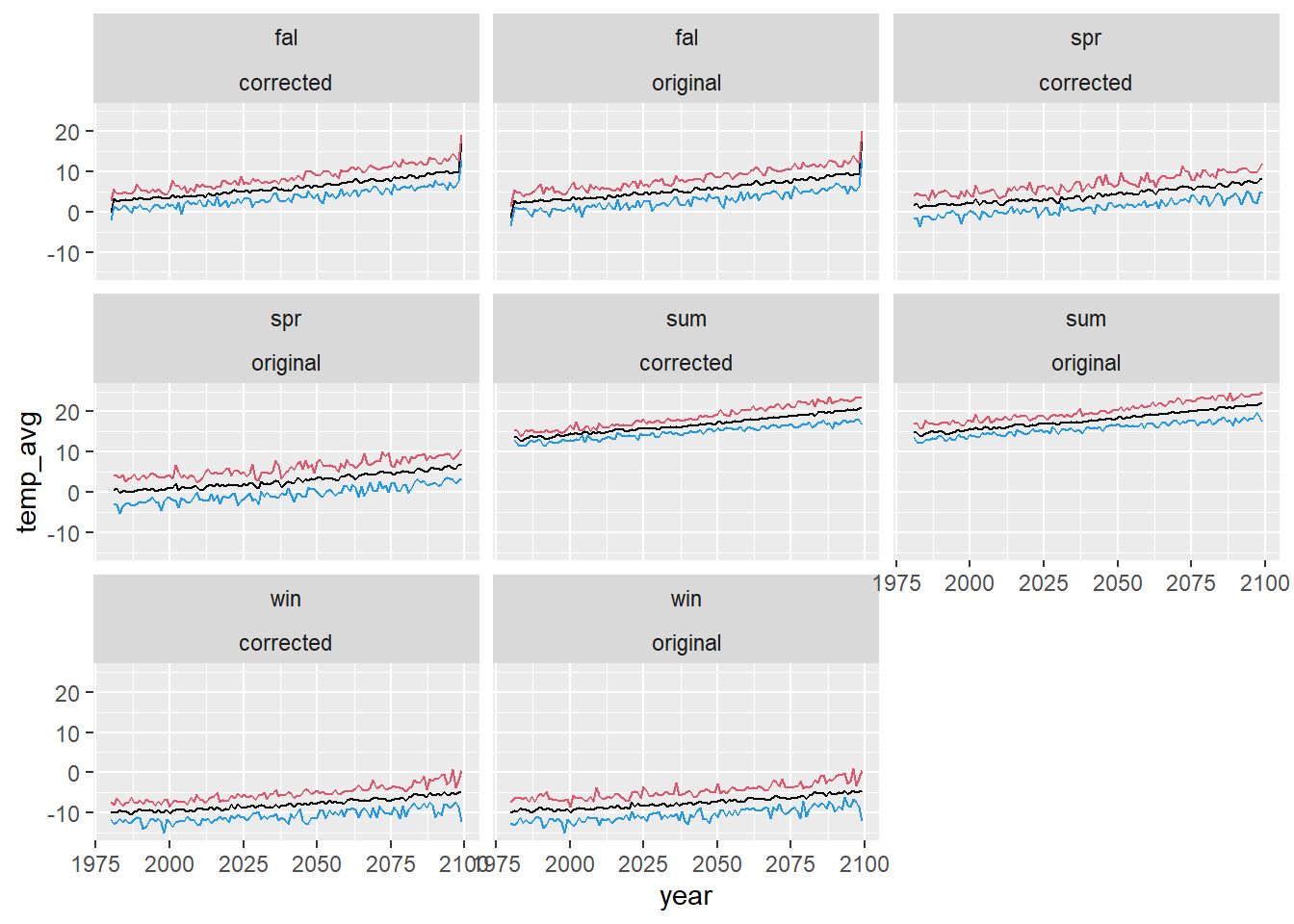 dat_summ <- dat3 %>% group_by(type, season, year) %>% summarize(count = n(), temp_avg = mean(temp_mean, na.rm = T), temp_sd = sd(temp_mean, na.rm = T), temp_min = min(temp_mean, na.rm = T), temp_max = max(temp_mean, na.rm = T)) %>% ungroup()Plot raw and corrected output: mean min and max