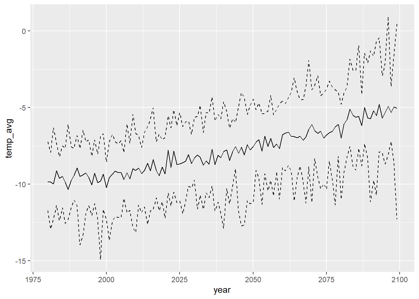 dat_summ %>% filter(season == "win", type == "corrected") %>% ggplot() + geom_line(aes(x = year, y = temp_avg)) + geom_line(aes(x = year, y = temp_min), linetype = 2) + geom_line(aes(x = year, y = temp_max), linetype = 2)