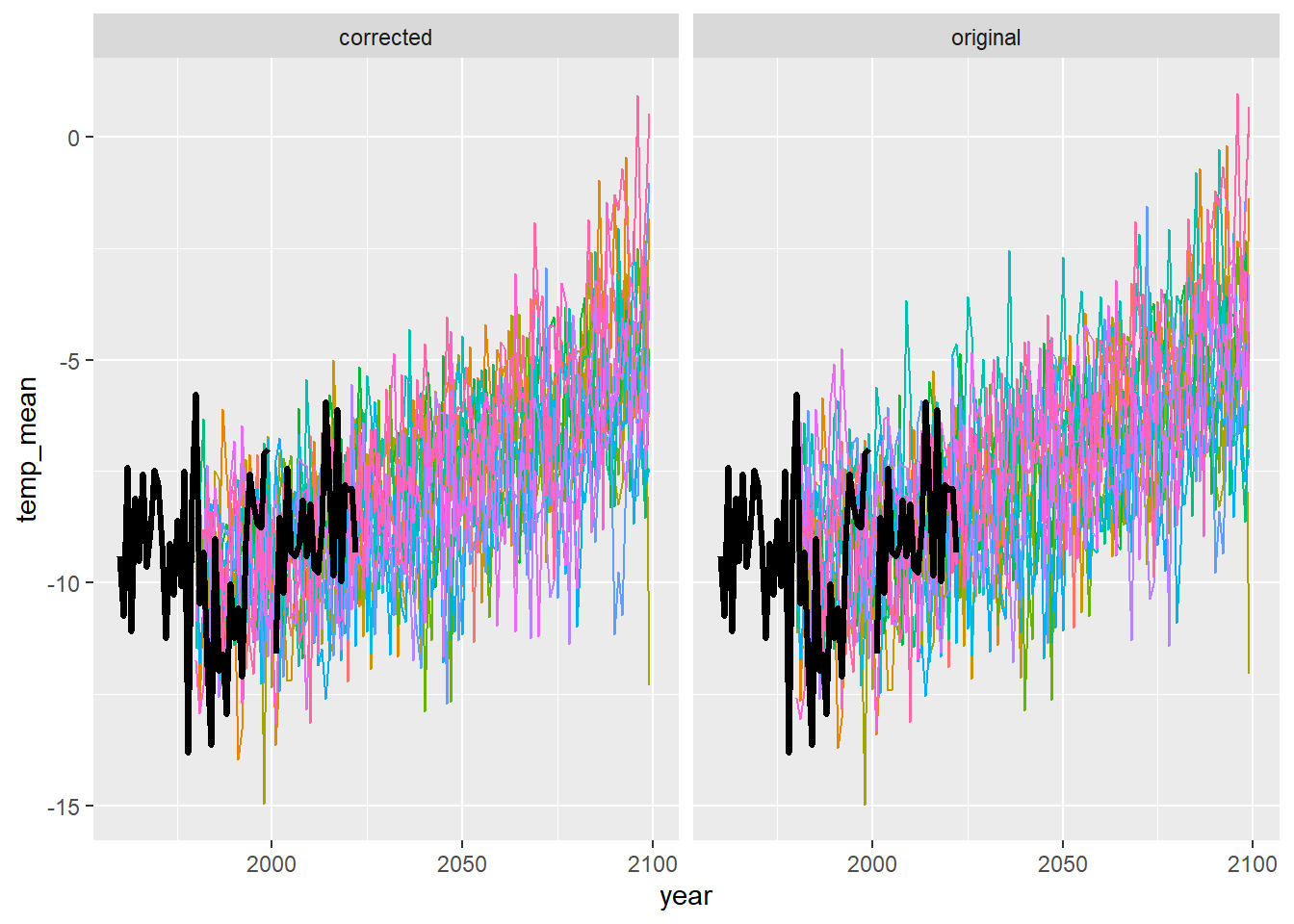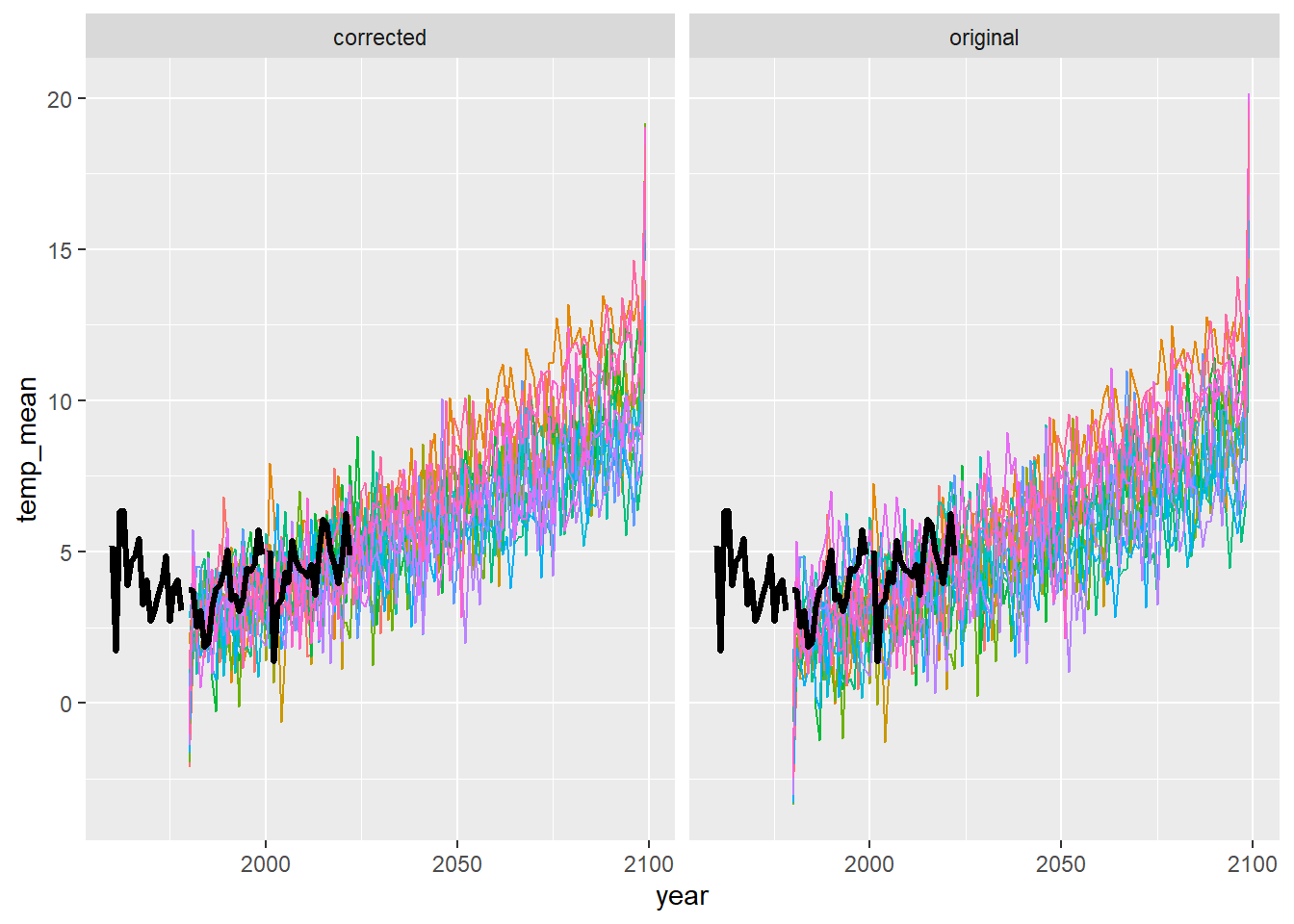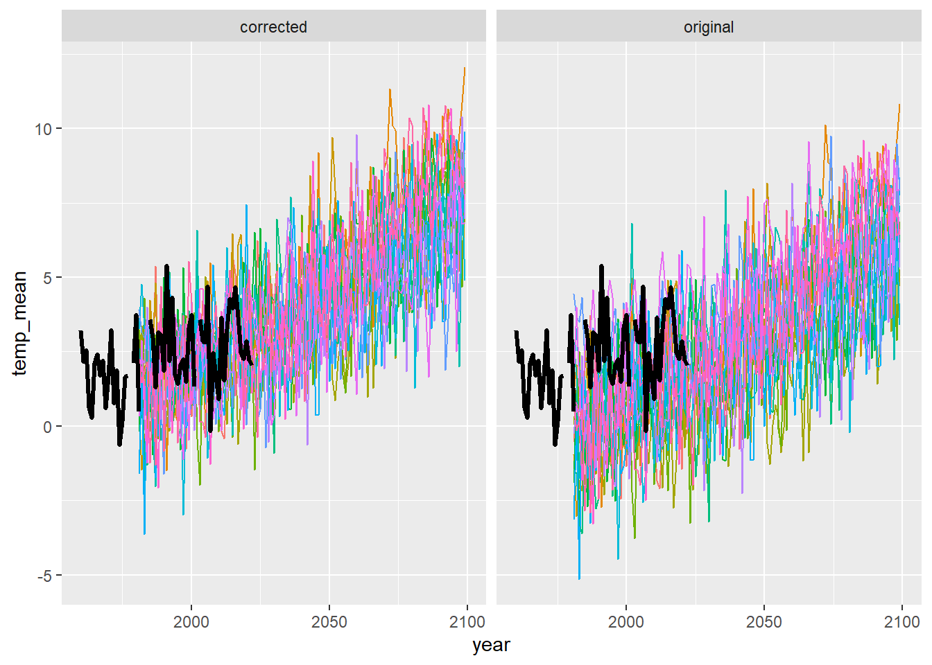 dat2 <- dat %>% group_by(gcm, type, date) %>% summarize(temp_mean = mean(temp)-273.15) %>% ungroup()