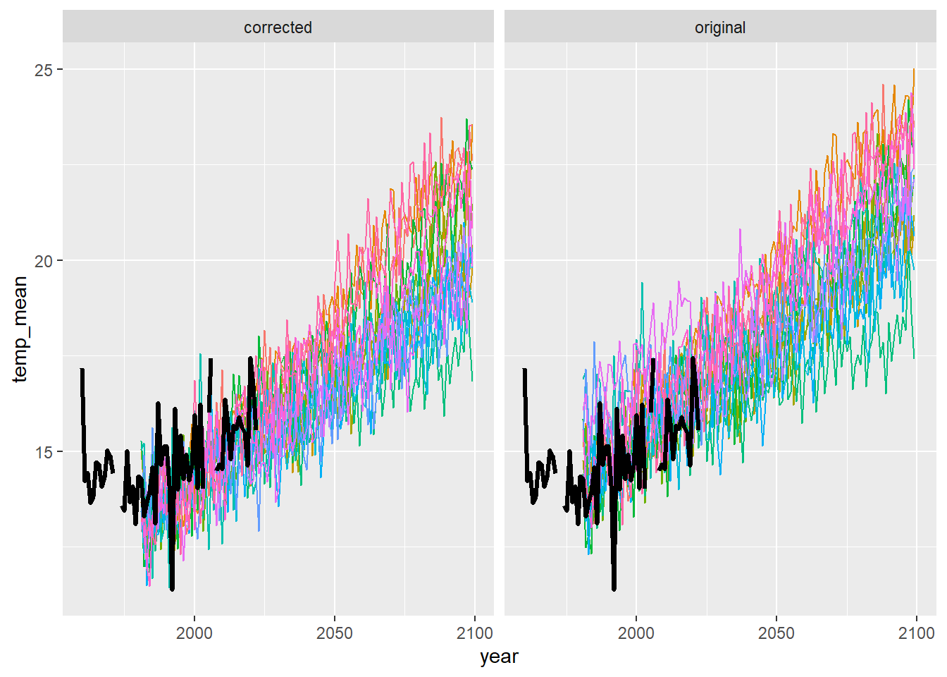 geom_line(data = dat3 %>% filter(season == "sum"), aes(x = year, y = temp_mean, group = gcm, colour = gcm)) +