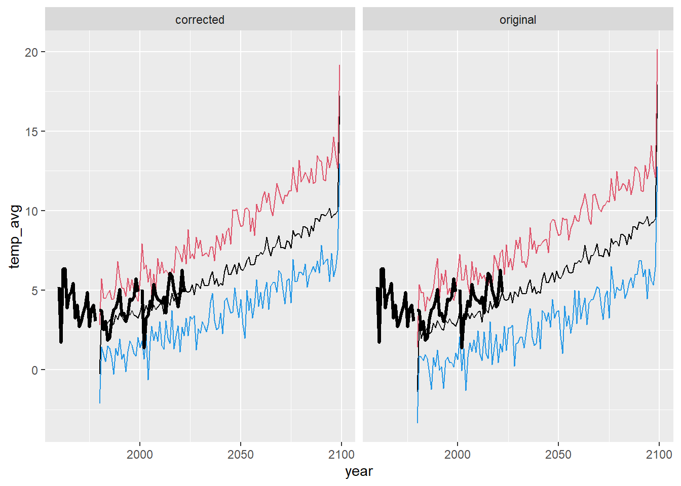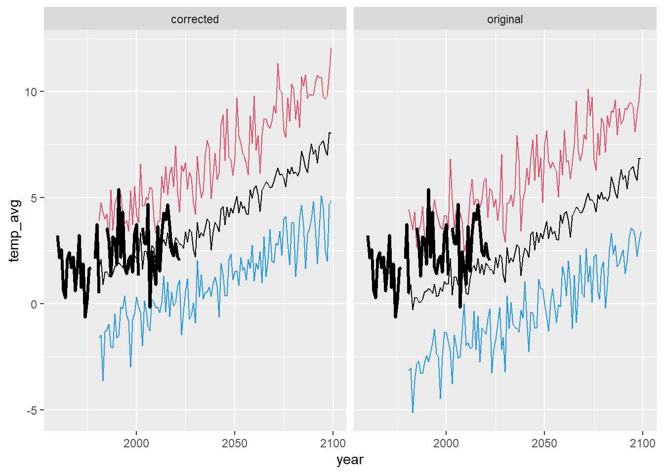 dat_summ %>% filter(type == "corrected", season == "sum", temp_avg >= c(maxobs[1,5])) # 2050-2055# A tibble: 48 × 8