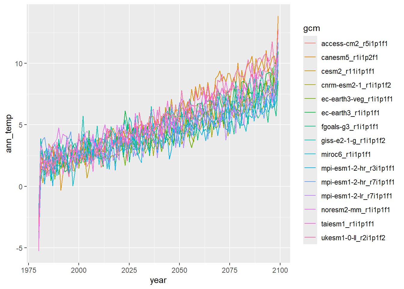 dat2 %>% mutate(year = year(date)) %>% group_by(gcm, year) %>% summarize(ann_temp = mean(temp_mean)) %>% ggplot() + geom_line(aes(x = year, y = ann_temp, group = gcm, colour = gcm))