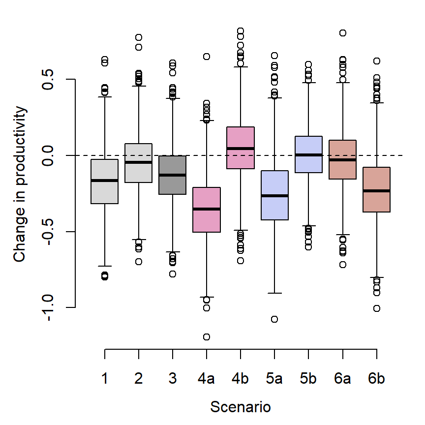 boxplot(productivity ~ scenario, prodtib, xlab = "Scenario", ylab = "Change in productivity", lty = 1, axes = FALSE,