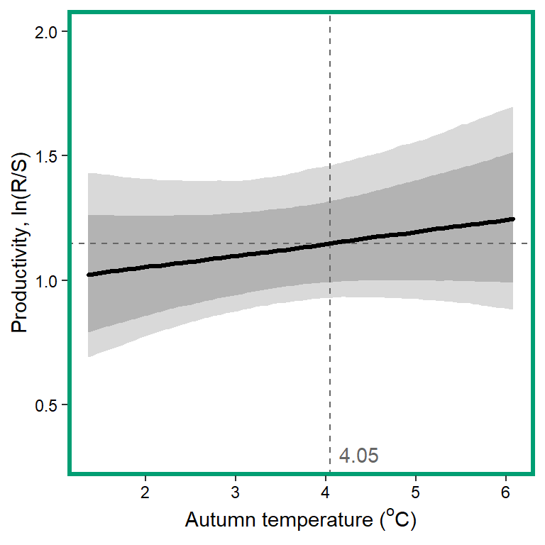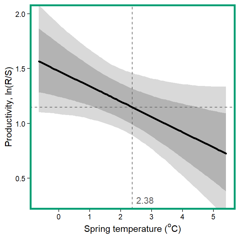 xlab(expression(paste("Spring temperature ("^"o", "C)", sep = ""))) + ylab("Productivity, ln(R/S)") +