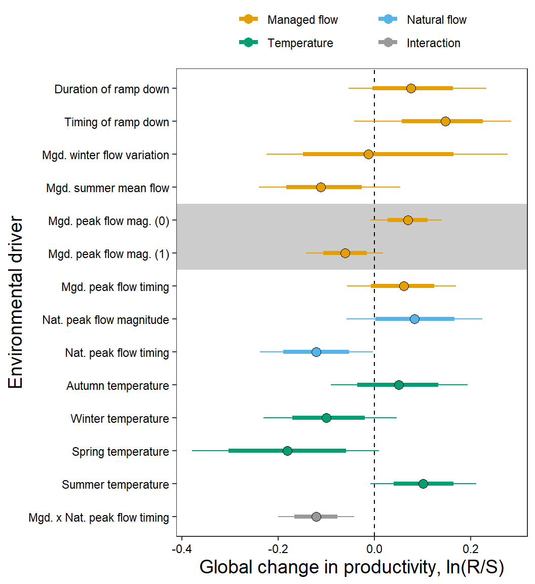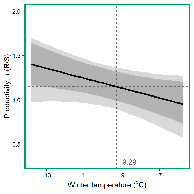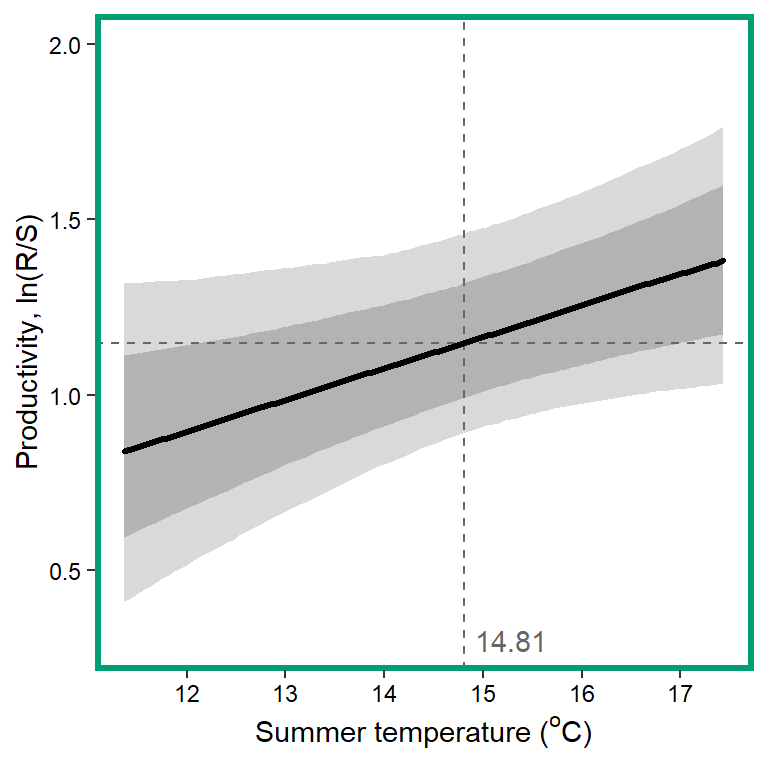 xlab(expression(paste("Summer temperature ("^"o", "C)", sep = ""))) + ylab("Productivity, ln(R/S)") +