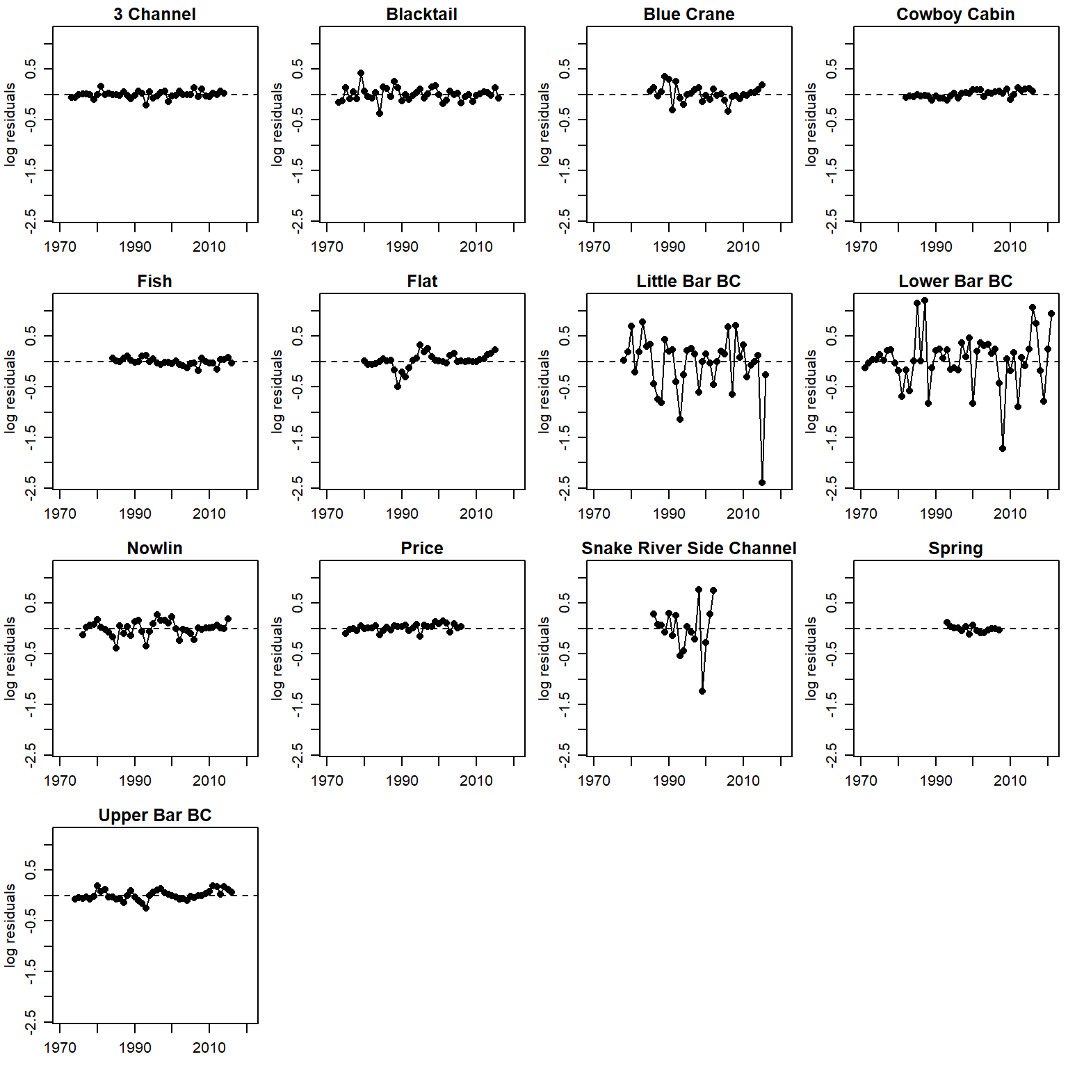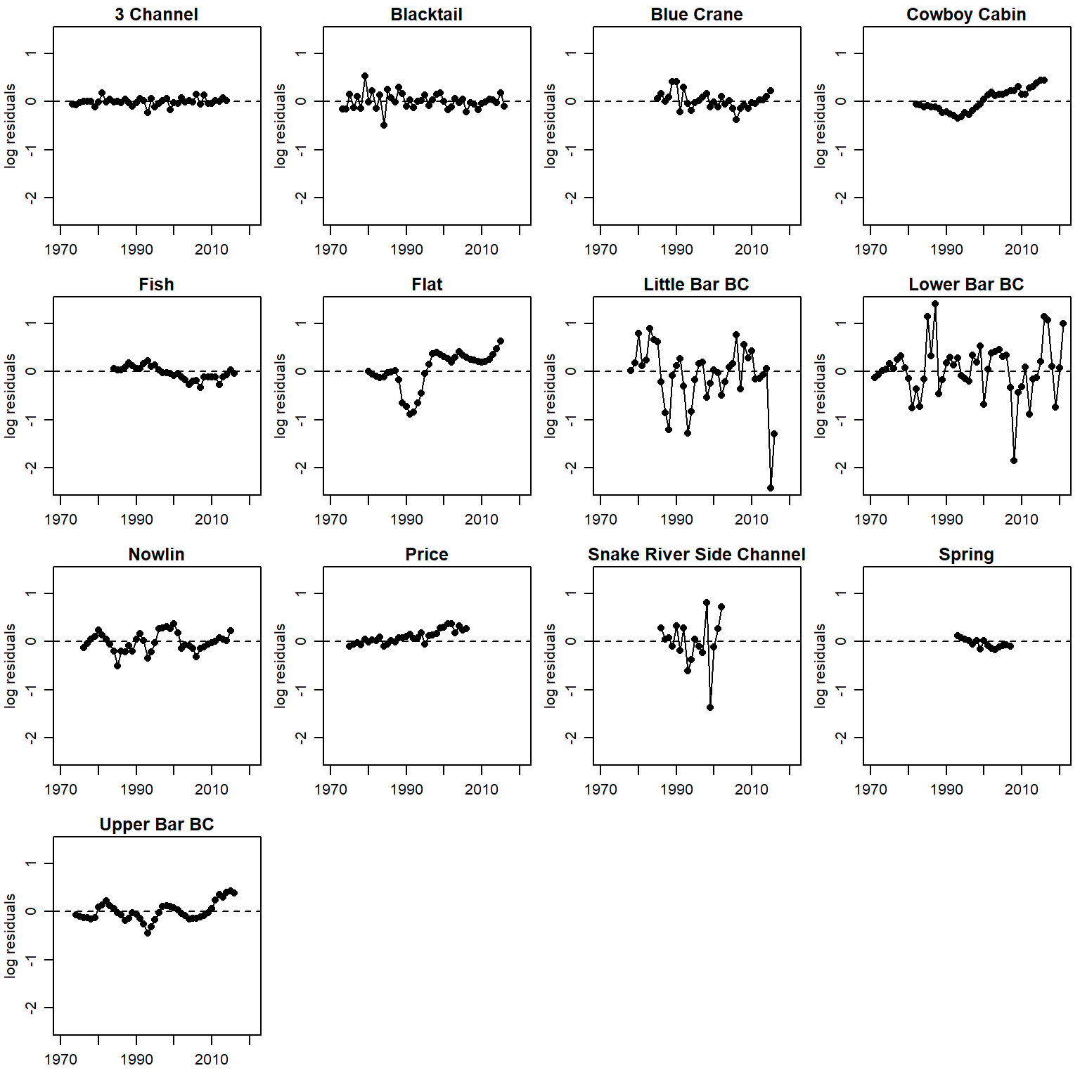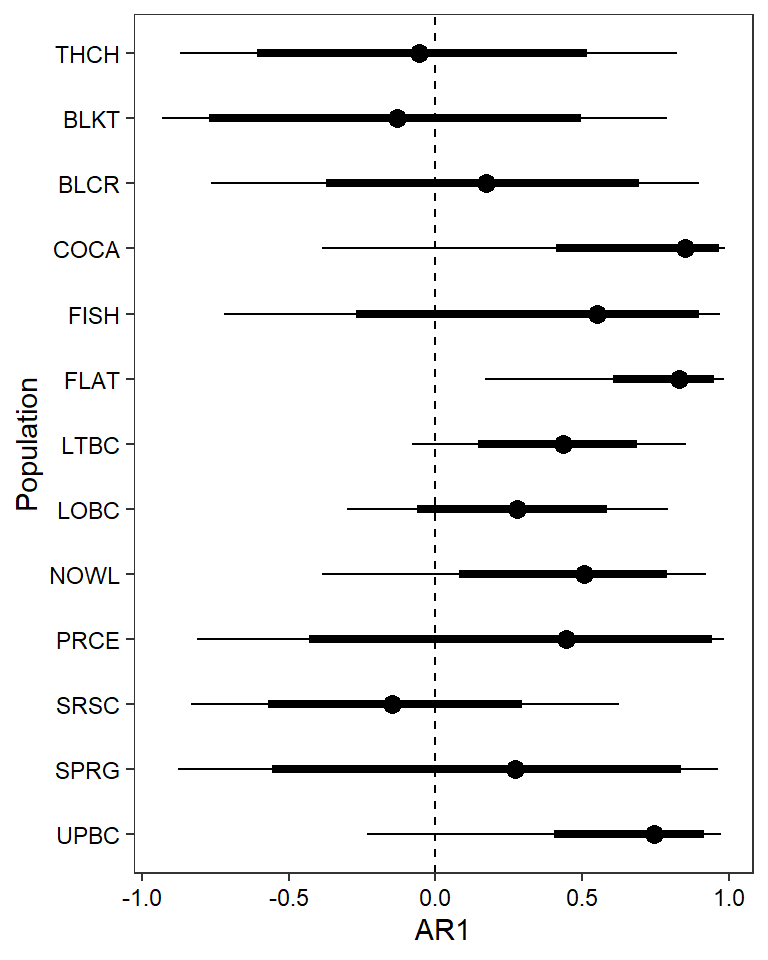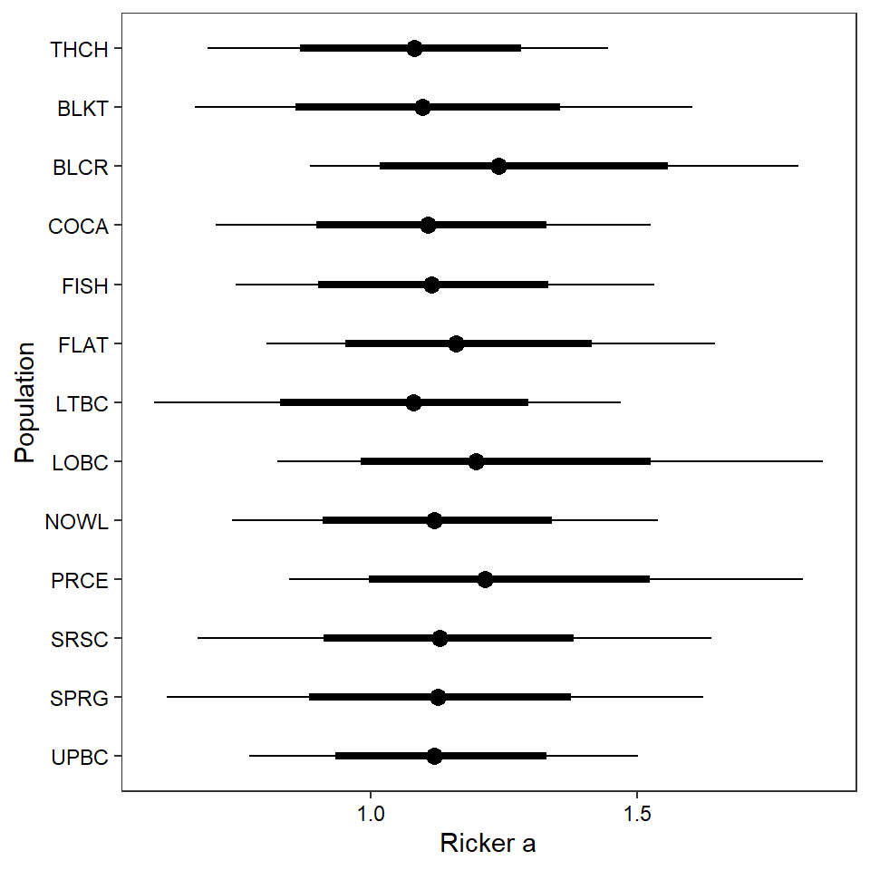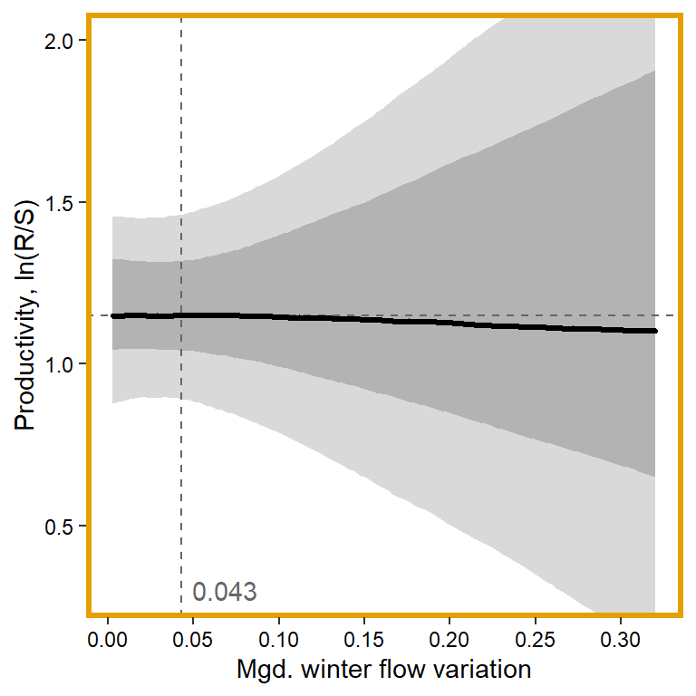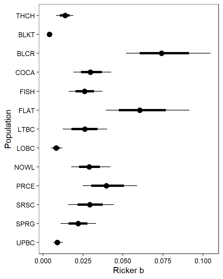 filter(!stream %in% c("Dave", "Snake River Side Channel", "Spring"))How much of the variation in productivity is explained by density-dependence alone? (sensu Jones et al. 2020)